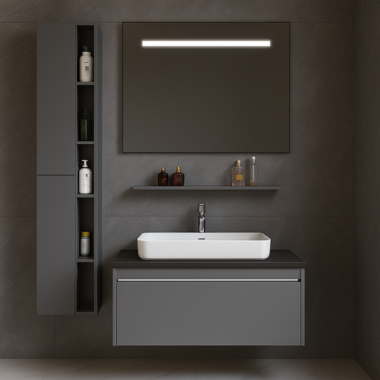 Модерни мебели за баня, с минималистичен и функционален дизайн. Комплекти със окачени шкафове, огледало и мивка, предлагани в различни размери. Много модели включват атмосферни светодиодни и меки-отбранителни решения за елегантна и организирана баня.