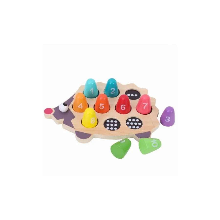 Дървеният таралеж е красиво оцветен и има 10 пешки, които се вписват в разфасовки върху тялото на таралежа. Всяка пешка има под нея графично представяне на цифра през точките. Например, Фигура 5 ще бъде представена с 5 точки.