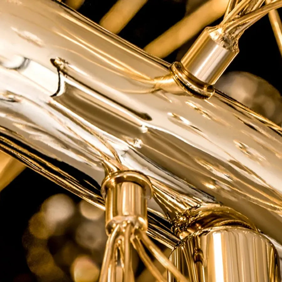 Окачен модел, с метална структура, завършена в блестящо злато и кристални декоративни елементи. Съвместим с 10 крушки* E14, храна към мрежата 220-230V, действие от класически превключвател.Подходящ за антре, спалня или всекидневна. Монтиране на таван, с регулируема височина, кръгла форма (60 см диаметър), максимална височина 100 см.