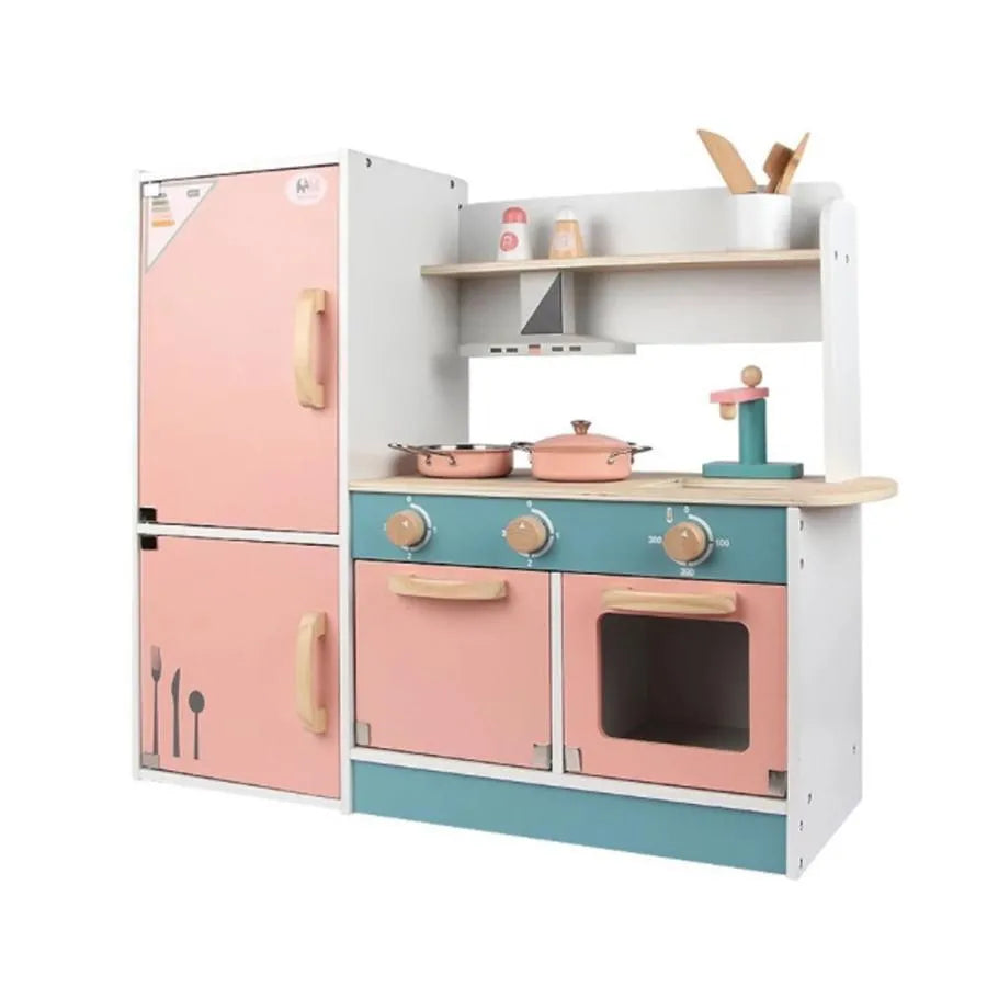 Пълна играчка тип кухня с различни аксесоари и хладилник, 45 броя, тюркоаз с розово, дърво