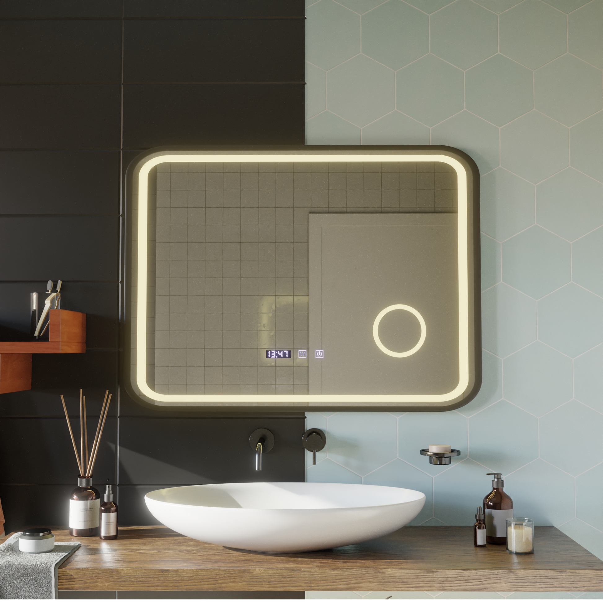 Правоъгълно светодиодно огледало, 60x80см, Eclat Motionglow Marcello, Clock & Thermometer, система за размразяване, козметичен луп