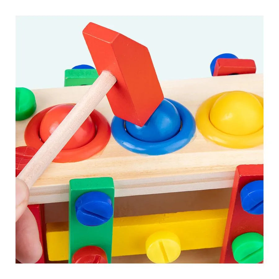2. Дървени инструменти: Комплектът включва нокти, чук и ключ, всички изработени от дърво, подходящи за малки ръце на деца. Тези инструменти помагат на малките да развият своите умения и координация на ръката.