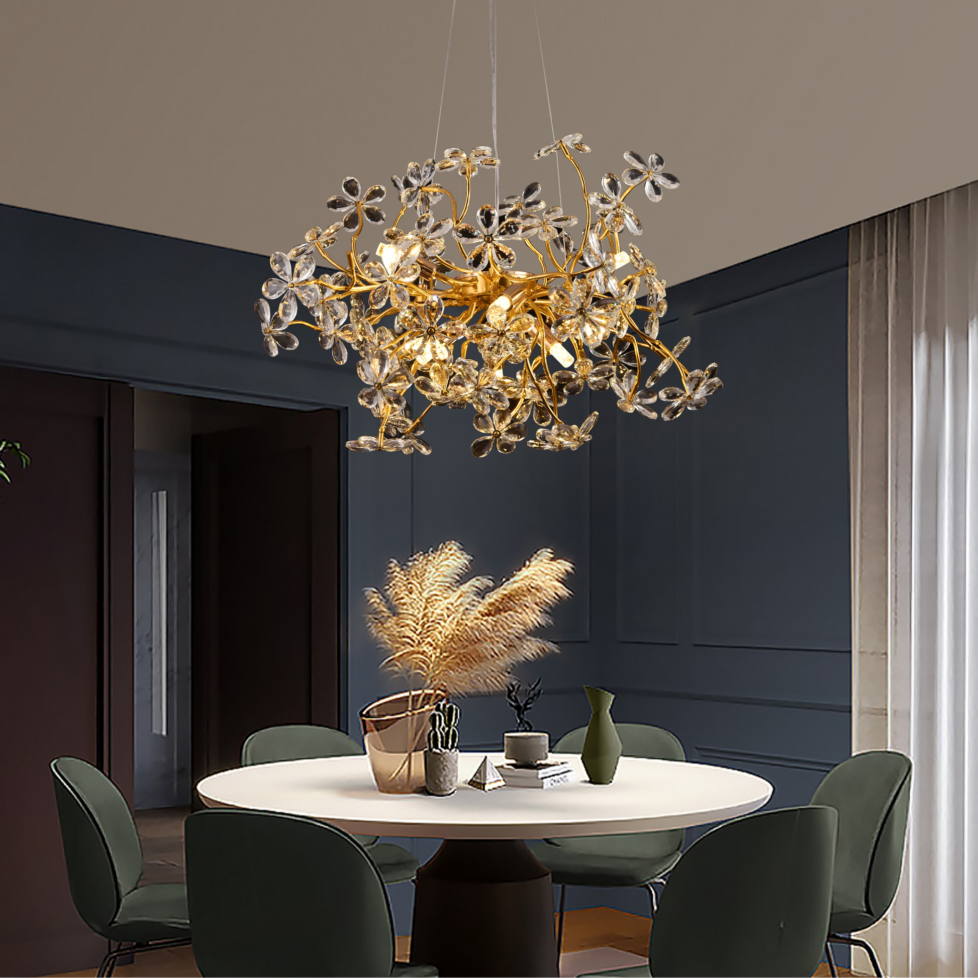 Кристалният полилей CM325/800GD е елегантно осветително тяло с модерен дизайн и луксозни акценти, идеално за изискан интериор. Снабден с 12 гнезда G9, той осигурява ефективно и равномерно осветление, подходящо за всекидневни, трапезарии или изискани коридори.