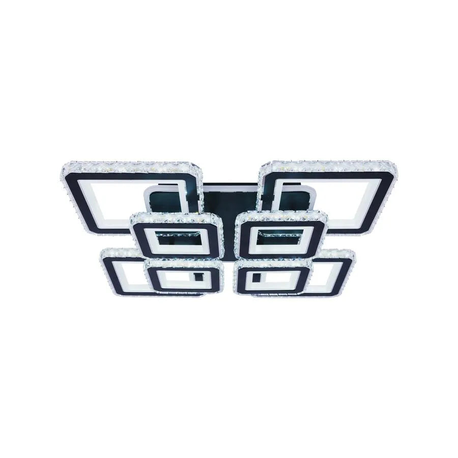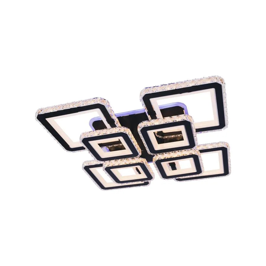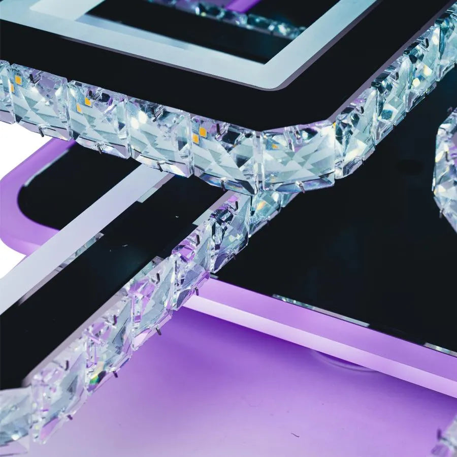 Осемте квадрата са украсени с искрящи кристали, които отразяват и пречупват LED светлината, създавайки завладяващ визуален ефект. Дистанционно управление включено ви дава пълен контрол: можете да избирате между светлина студено, горещ или неутрален за основното осветление можете да регулирате интензитета на светлината с функцията за затъмняване и най-интересното е, че можете да избирате от различни RGB цветове, за да създадете уникална и персонализирана атмосфера.