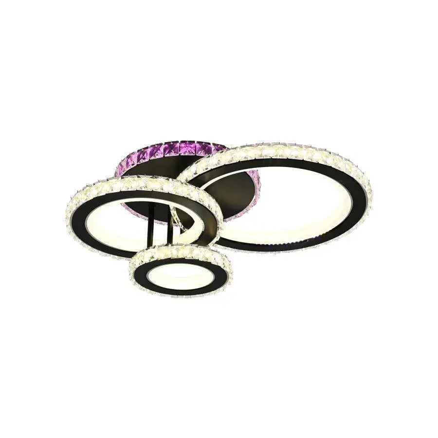 Трите черни кръга, украсени с кристали, създават елегантен и сложен контраст. Кристалите ще отразяват и пречупват интегрираната LED светлина, генерирайки блестящ ефект и луксозна атмосфера. Включеното дистанционно управление ви дава контрол не само върху цветовата температура (студена, гореща или неутрална) и интензивността на светлината (нестабилна), но и върху функцията RGB, който ви позволява да избирате от широка цветова палитра, за да създадете динамични и персонализирани светлинни ефекти.