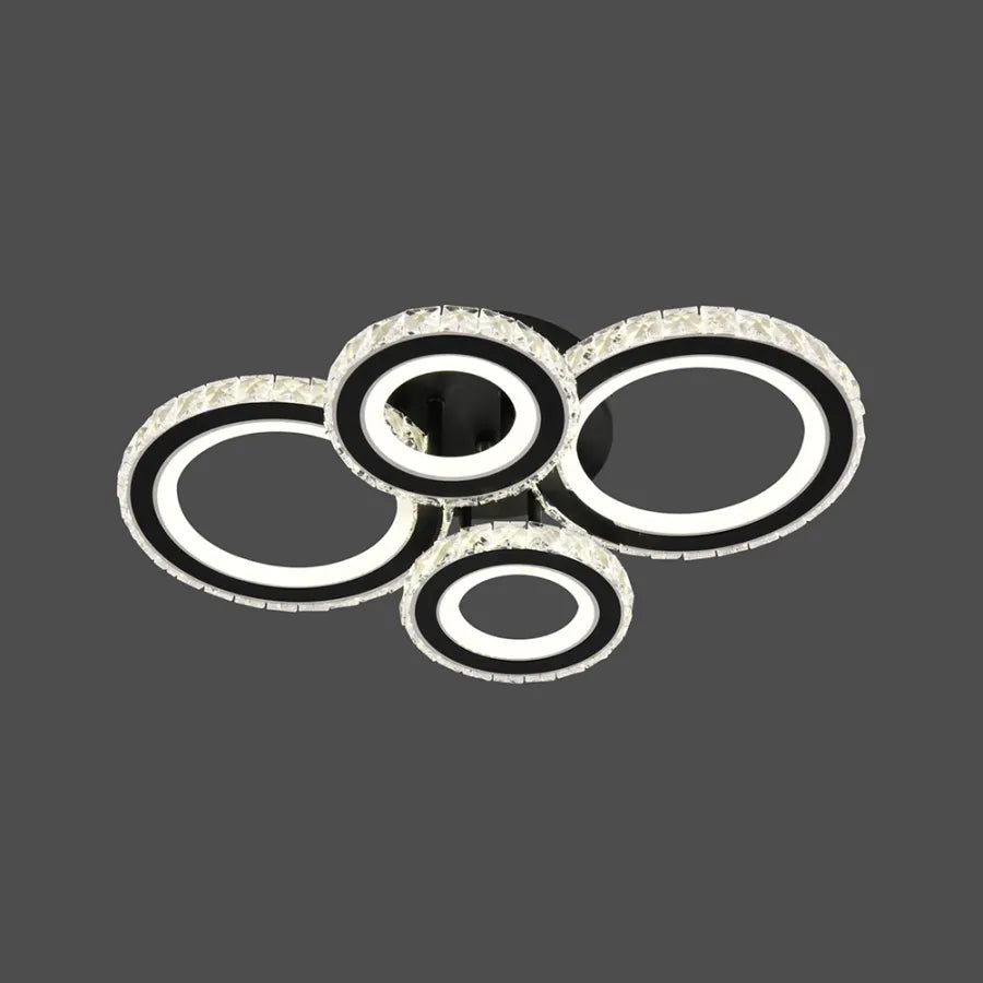 Четирите черни кръга, украсени с кристали, създават елегантен и изтънчен контраст. Кристалите ще отразяват и пречупват интегрираната LED светлина, генерирайки искрящ ефект и луксозна атмосфера. Включеното дистанционно управление ви дава контрол не само върху цветовата температура (студена, топла или неутрална) и интензитета на светлината (с възможност за димиране), но и върху функцията RGB, което ви позволява да избирате от широка гама от цветове, за да създадете персонализирани и живи светлинни ефекти.