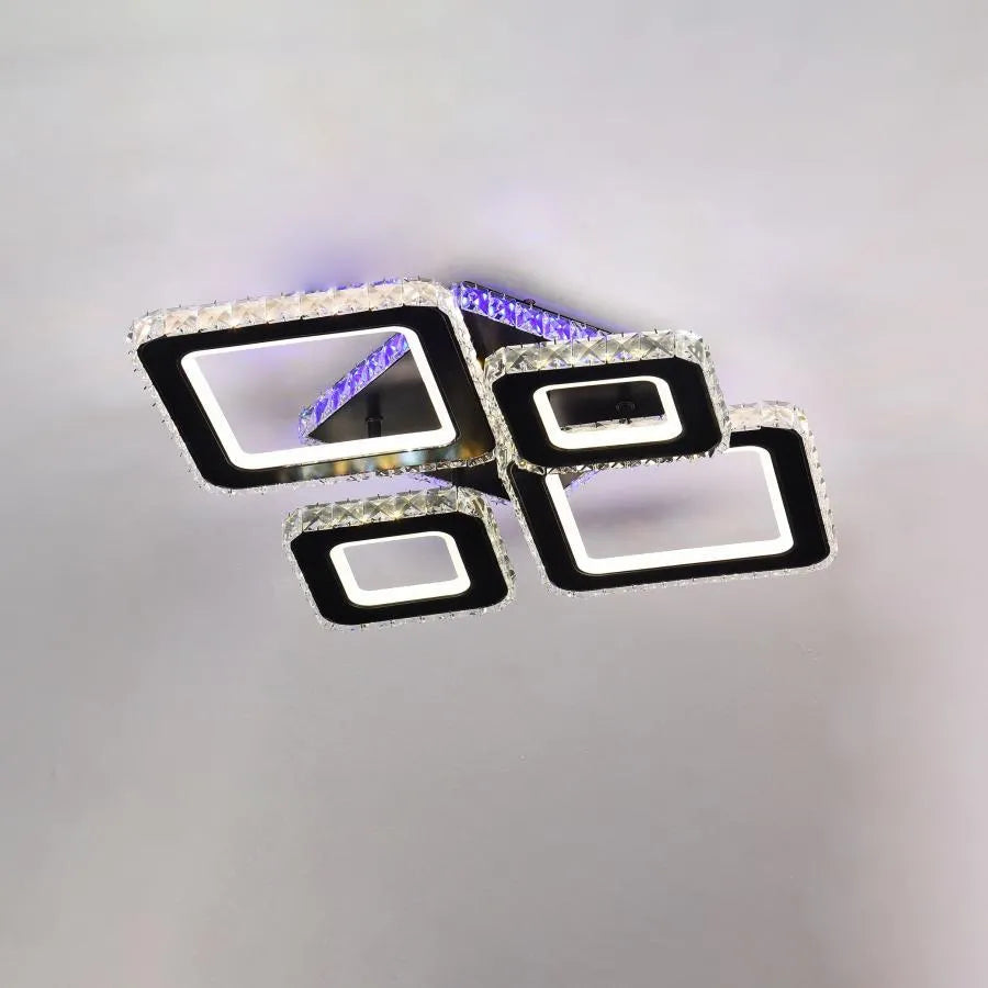 Четирите черни квадрата, украсени с кристали, създават елегантен и изтънчен геометричен вид. Кристалите ще отразяват и пречупват интегрираната LED светлина, генерирайки искрящ ефект и луксозна атмосфера. Включеното дистанционно управление ви дава контрол не само върху цветовата температура (студена, топла или неутрална) и интензитета на светлината (с възможност за димиране), но и върху функцията RGB, което ви позволява да избирате от широка гама от цветове за създаване на динамични и персонализирани светлинни ефекти.