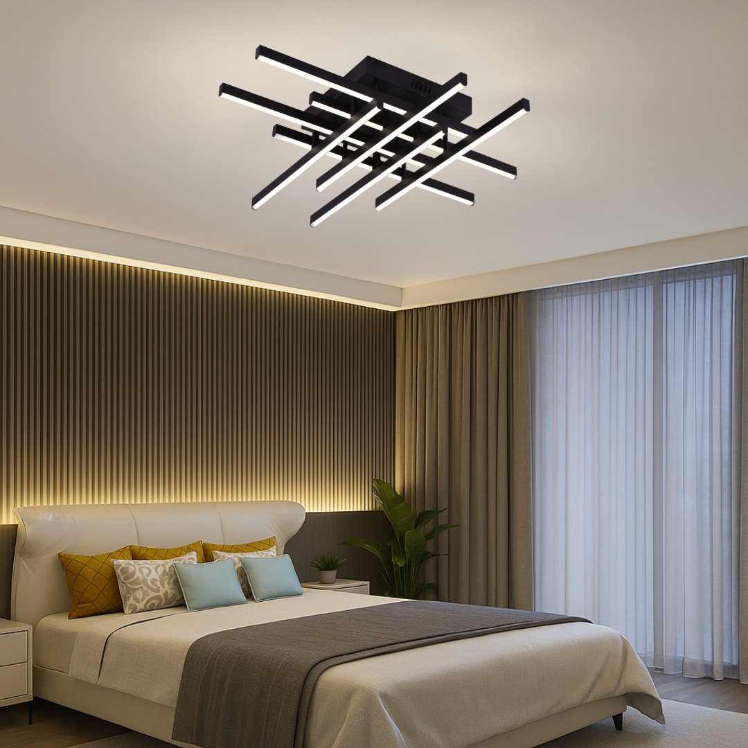LED полилей с дистанционно управление LINEX модел с 8 рамена е с мощност от 90W и светлинен поток от 7200 lm, осигурявайки светлината Димируем с избираеми температури: 3000K, 4000K, 6000K (топло, неутрално, студено). Работи при 220–230V, с автономия от 25 000 часа, и се контролира от дистанционно управление или класически ключ. Има дизайн линеен, монтаж приложен към тавана, направени от метал и акрил, завърши черен. Размери: 62см дължина, 23см ширина, 13см височина. защита IP20, храна към мрежата. Препоръчва се за спалня, хол или антре.